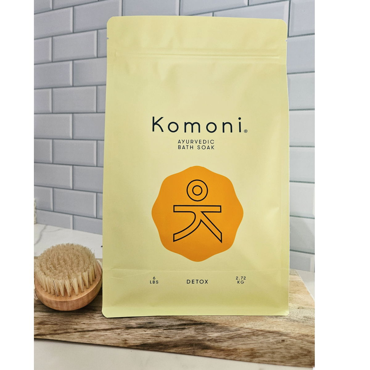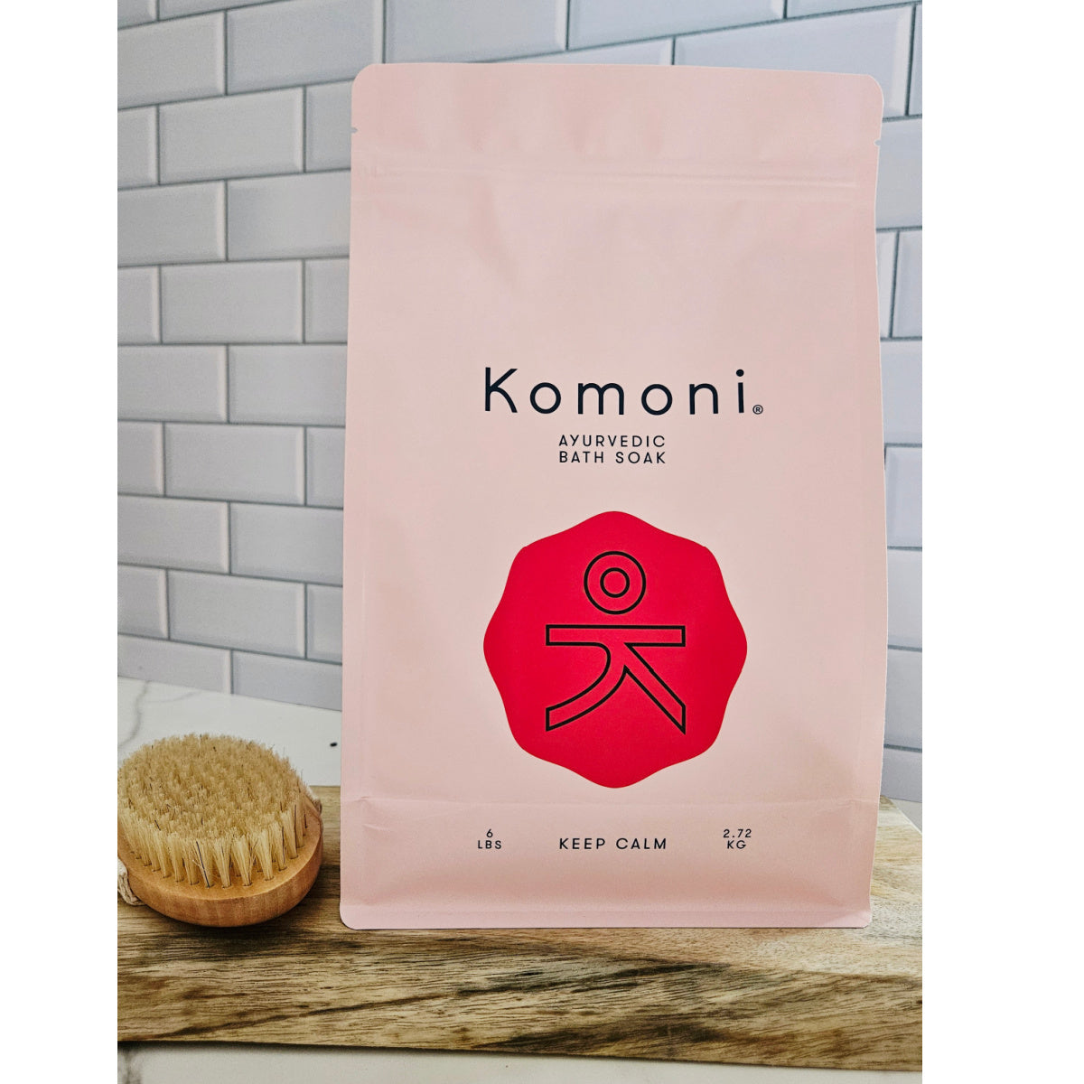 Vangie present a blue package of RECOVERY Bath Soak labeled 'Komoni' against a blurred natural background